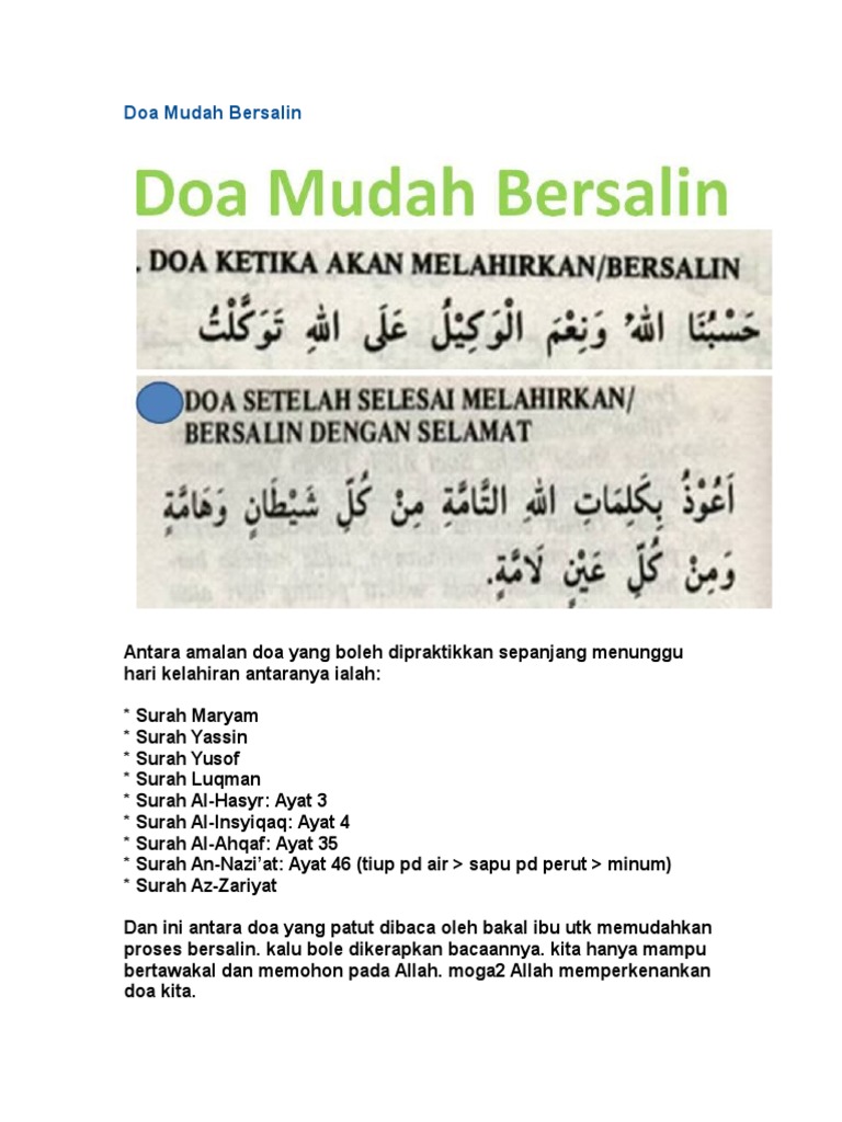 Doa Mudah Bersalin 3 Doa Diberikan Kebaikan Dalam doa dipermudahkan bersalin ini kita memohon dua perkara iaitu yang pertama ialah kemudahan dalam melahirkan zuriat. Dengan keyakinan dan iman yang tinggi pastinya akan mudah. Doa Mudah Bersalin Zikir Surah Yang Boleh Diamalkan Bakal Ibu.