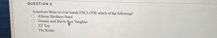 QUESTION 5 American blues revival bands EXCLUDE which of the following. école primaire centre médicalisé et logement social. Allman Brothers Band Jimmie and Stevie Ray Vaughan ZZ Top The Kinks оооо.